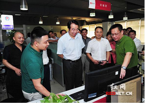 許又聲部長(zhǎng)(左三)在中南傳媒董事龔曙光(左二)陪同下視察紅網(wǎng)