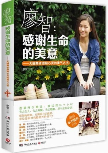 《廖智:感謝生命的美意》一書,記載了廖智作為一個失去雙腿的舞者對生命的思索和對夢想的追尋的勵志經(jīng)歷。此書由中南傳媒旗下的博集天卷和湖南文藝出版社精心制作,排版精美,有大量廖智在生活和排練中的真實照片,悲愴的舞姿震撼人心。此書上市后被稱為“激勵心靈的勇氣之書”,大量廖智的內(nèi)心獨白感人至深,獲得柴靜、楊瀾、撒貝寧、魯豫等眾多名人的推薦。