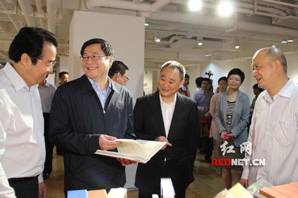(湖南省委副書記、省長杜家毫[左二]在湖南美術出版社視察,了解中南傳媒圖書出版發行情況。)