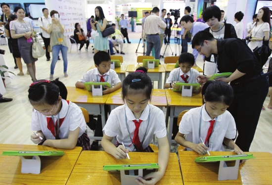 在演示上課的過程中,“老師”手執(zhí)平板電腦,“學(xué)生”的課桌上也每人有一臺平板電腦。“老師”播放的拔河比賽動畫,“學(xué)生”在自己的平板電腦上可以同步看到,并在電腦上完成習(xí)題。電腦系統(tǒng)后臺可以實現(xiàn)對每位學(xué)生所做客觀題的對錯進(jìn)行判分,并反饋到“老師”手中的電腦上,老師據(jù)此掌握到了每個學(xué)生課堂學(xué)習(xí)情況,并可以進(jìn)行重點(diǎn)教學(xué)和分層次教育。