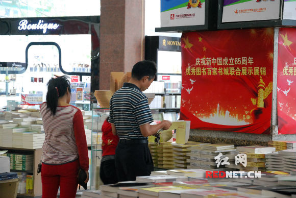在湖南圖書城、邵陽湘中圖書城,門口懸掛著“慶祝新中國成立65周年優(yōu)秀圖書百家書城聯(lián)合展示展銷活動(dòng)”的橫幅,進(jìn)門最顯眼處就是集中展示《之江新語》、《改革熱點(diǎn)面對(duì)面》、《鄧小平》等上百種優(yōu)秀圖書的專區(qū)。兩家書城都在國慶期間延長營業(yè)時(shí)間,并對(duì)讀者購書提供優(yōu)惠活動(dòng)。