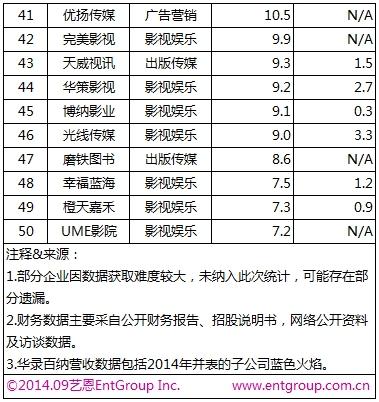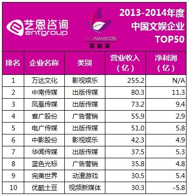 近日,由藝恩主辦的“紫勛之夜”頒獎盛典在京開幕。頒獎典禮現(xiàn)場發(fā)布了2013-2014年度中國文娛企業(yè)50強榜單。